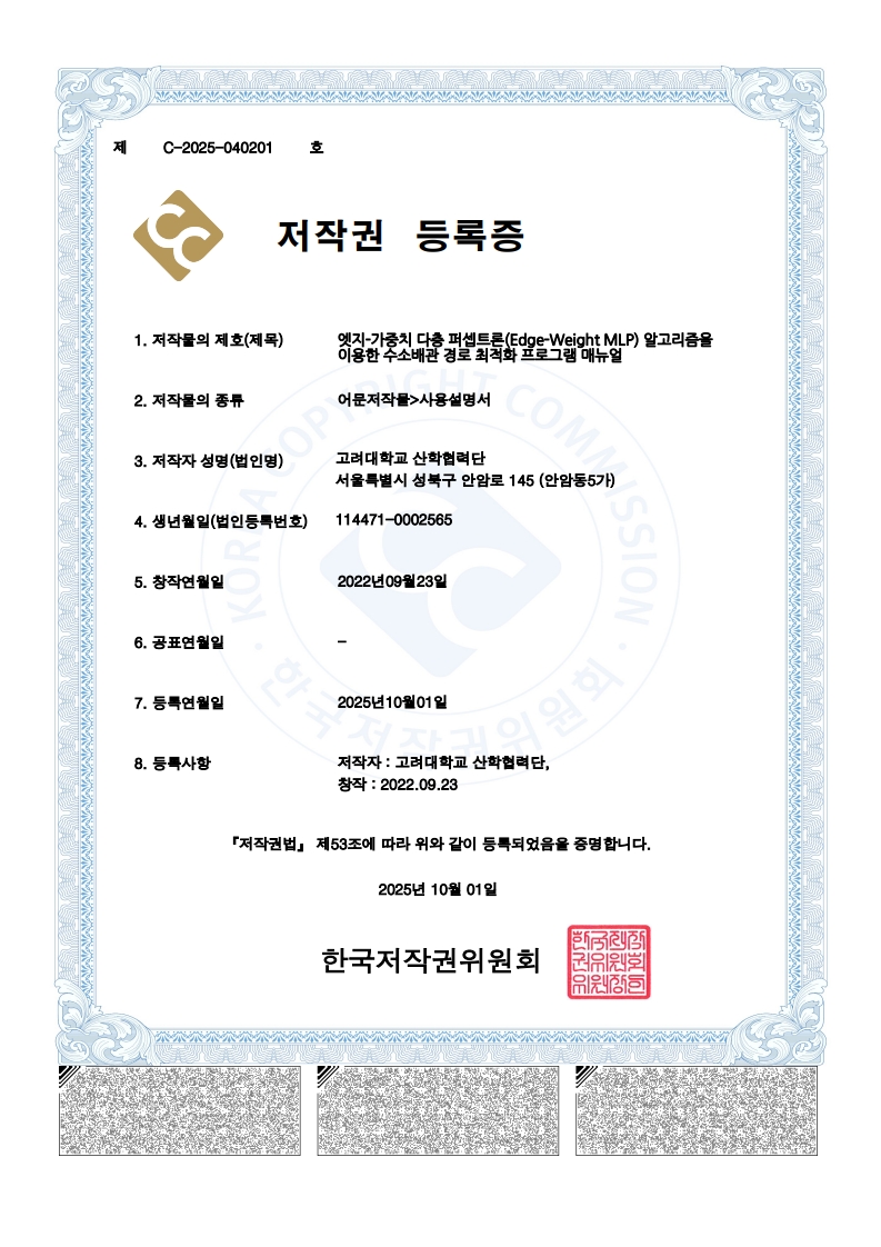 [컴퓨터프로그램 저작권 등록] 엣지-가중치 다층 퍼셉트론(Edge-Weight MLP) 알고리즘을 이용한 수소배관 경로 최적화 프로그램